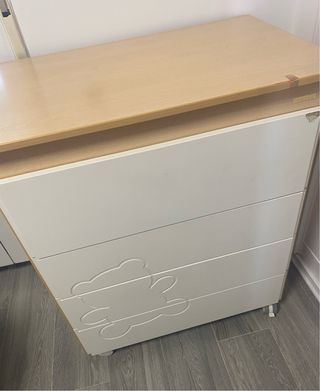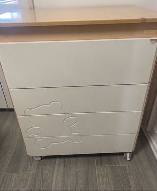 Cómoda infantil de la marca Micuna con un diseño dulce y divertido. - Cuatro cajones amplios. - Tiradores redondos blancos. - Decoración de nubes y corazones. A recoger en Alcorcon