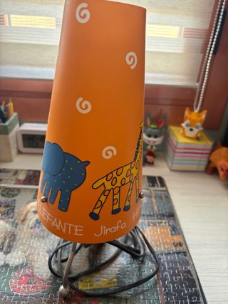 Lámpara de mesa con un diseño infantil y alegre, perfecta para la habitación de los más pequeños. Presenta dibujos de un elefante y una jirafa sobre un fondo naranja. - Diseño con animales. - Color naranja. - Estilo divertido.