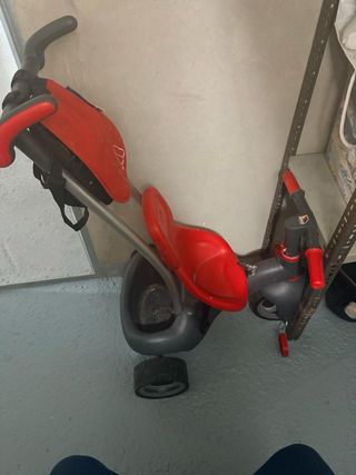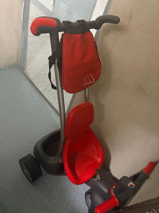 Triciclo para niños con un diseño moderno y funcional. - Estructura principal en color gris. - Asiento y detalles en color rojo. - Bolsa de almacenamiento frontal roja.