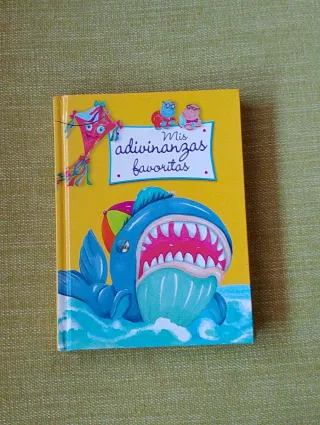 Libro infantil con divertidas ilustraciones. - Título: Mis adivinanzas favoritas - Diseño llamativo con un tiburón y una cometa. - Páginas con enigmas y acertijos para niños.