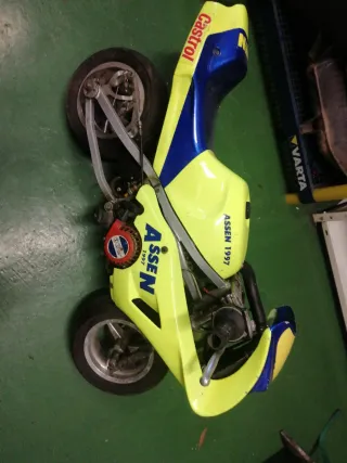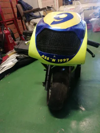 Mínimoto DM1 de estilo infantil, con un diseño llamativo en colores azul y amarillo. Regalo protecciones de piernas y brazos también pantalón. Modelo de mínimoto ganadora el campeonato de España,Italia etc.. - Chasis robusto. - Ruedas de goma. - Asiento cómodo.
