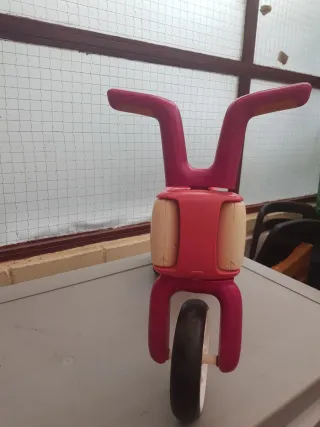 Triciclo infantil con un diseño moderno y divertido. - Manillar en color rosa. - Asiento y detalles en color beige. - Rueda delantera negra con llanta blanca.