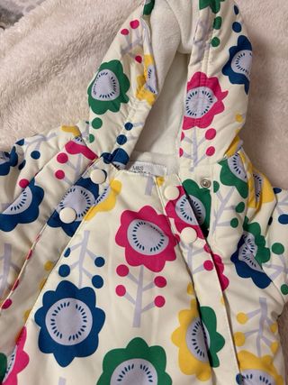 Mono de invierno para bebé con un alegre estampado de flores. - Diseño con capucha. - Cierre de botones. - Estampado multicolor sobre fondo blanco.