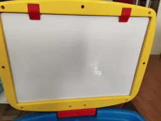 Maletín con pizarra magnética para niños. Ideal para llevar a todas partes y fomentar la creatividad. - Color verde y azul. - Marco rojo. Contiene más de 30 letras grandes y más de 60 pequeñas magnéticas, números de 0 al 9 , un signo de cada operacion como resta, igual, multiplicación y división y portatizas. Se puede poner hojas para pintar ya que lleva pinzas para sujetarlas. El maletín se puede usar una parte con tizas, otra con rotulador de pizarra y esa misma con las letras y números imantados. Hay fotos de unos arañazos.