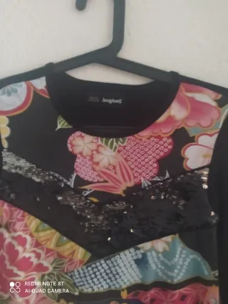 Vestido infantil de la marca Desigual con un vibrante estampado floral. 9-10 años - Mangas largas negras. - Cuerpo con diseño patchwork y detalles de pedrería. - Estampado principal de flores y mariposas.