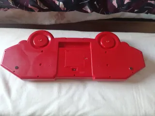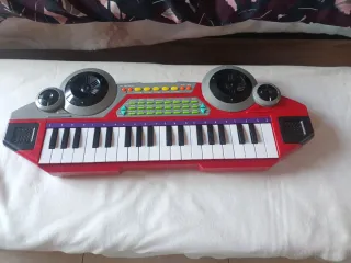 Teclado musical infantil de color rojo con múltiples funciones. - Diseño atractivo con altavoces. - Teclas blancas y moradas. - Botones de colores para diferentes sonidos y ritmos.