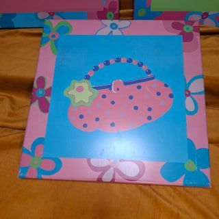 Conjunto de tres cuadros decorativos con motivos infantiles. - Diseño de sombrero con flores. - Diseño de traje de baño a rayas. - Diseño de bolso con lunares.