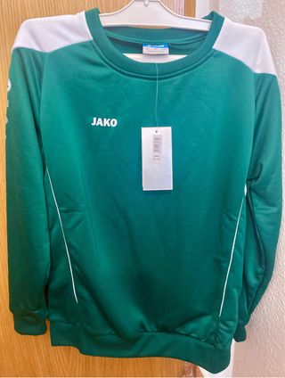 Sudadera deportiva infantil de la marca Jako, completamente nueva y con etiquetas. - Color principal verde con detalles blancos. - Diseño deportivo. - Talla infantil.(152cm) -tecnologia que la humedad o sudor no se queda en el tejido , rapido secado