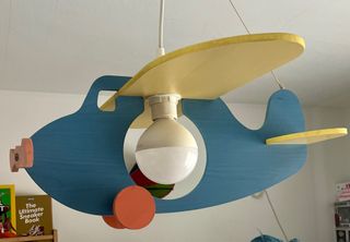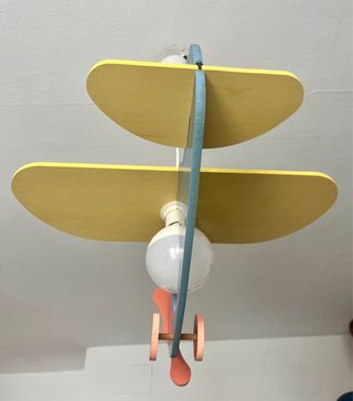 Original lámpara de techo con diseño de avión, ideal para habitaciones infantiles. Añade un toque divertido y lúdico al espacio. - Forma de avión. - Combinación de colores azul, amarillo y naranja.