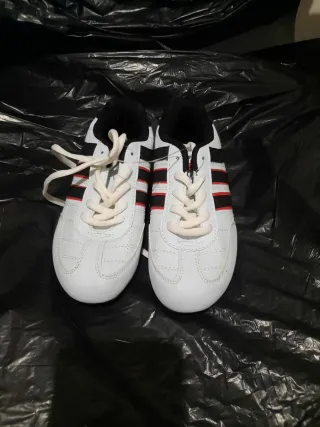 Zapatillas deportivas/casual de color blanco con detalles en negro y rojo. - Cierre con cordones. - Diseño deportivo. -TALLA 32 - Aún mantiene la brida. No se han usado nunca