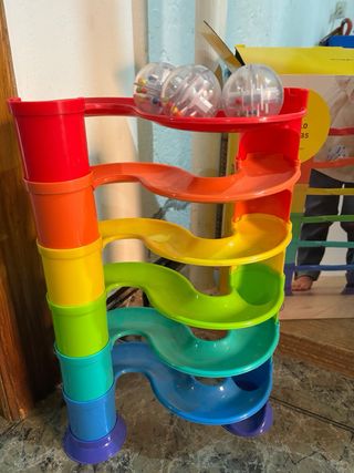 Divertido circuito de 3 bolas de colores para niños. Incluye la caja original. - Estructura multicolor. - Varios niveles y rampas. - Bolas transparentes con cascabeles.
