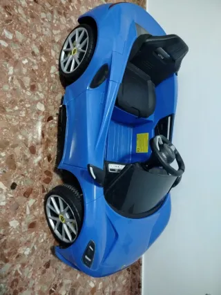 Coche eléctrico infantil de color azul, perfecto para que los más pequeños disfruten. - Diseño deportivo. - Asientos negros. - Volante. - Ruedas con llantas plateadas.