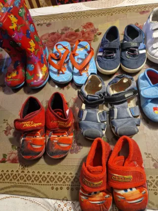Lote de 8 pares de zapatos infantiles en tallas de la 25 a la 28. - Botas de agua rojas con dinosaurios. - Chanclas azules con tiburones. - Zapatillas deportivas azules. - Zapatillas blancas de velcro. - Zapatillas de estar por casa azules con tractor. - Sandalias azules. - Zapatillas rojas de Cars. - Zapatillas rojas de Cars.