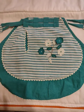 Mandil infantil vintage con un bonito diseño de rayas y flores aplicadas. - Diseño a rayas blancas y verdes. - Adorno floral con flores blancas y verdes. - Borde festoneado. - Lazos para atar.