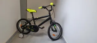 Bicicleta infantil de Decathlon, ideal para los más pequeños. - Color negro con detalles en verde lima y amarillo. - Ruedines incluidos para facilitar el aprendizaje. - Diseño divertido con estrellas y siluetas.