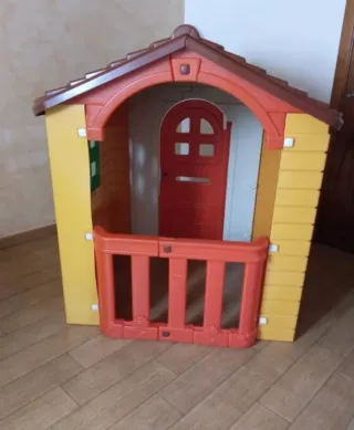 Casita de juguete de plástico para niños, ideal para jugar en interiores o exteriores. Tiene un diseño colorido y divertido. - Paredes amarillas y techo naranja. - Puerta roja con detalles. - Barandilla frontal naranja.