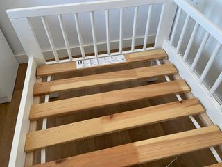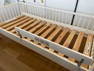 Cama infantil estilo Montessori, perfecta para fomentar la autonomía. - Medidas: 70x140 cm. - Estructura en color blanco. - Incluye somier. - Nuevo, sin desembalar. Precio original: 181€ Aviso: Faltan tres listones pequeños correspondientes a la barrera protectora. El paquete llego incompleto. Facilmente solucionable. *VENTA EN PERSONA*