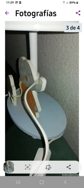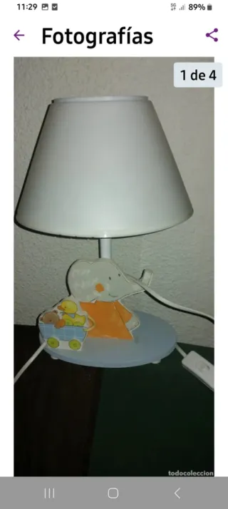 Lampara de mesita de noche infantil con un simpático diseño de elefante. Mide 37 cm de altura. Elefante en madera. - Base redonda de color azul claro. - Figura de elefante con un carrito. - El carrito contiene un osito y un patito. - Pantalla cónica de color blanco.