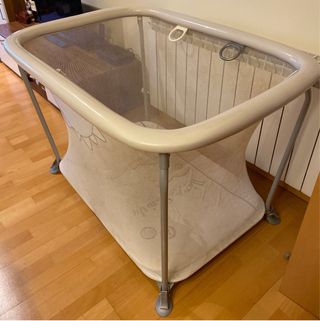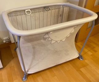 Parque infantil con estructura de metal y malla. - Laterales de malla transpirable. - Bordes acolchados. - Cuatro asas de sujeción en el interior.