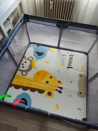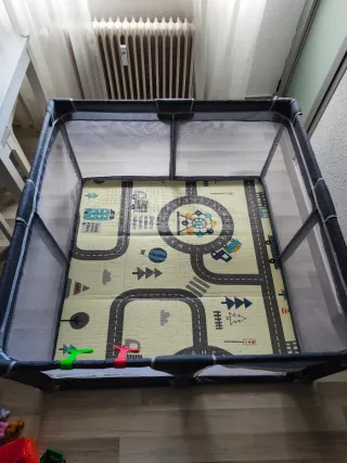 Parque de juegos seguro y espacioso para bebés. Ideal para que los más pequeños jueguen y exploren con tranquilidad. - Estructura de malla transpirable. - Base acolchada con diseño de carretera. - Fácil de montar y desmontar. Se regala la alfombra que sale en las fotos,esa si que está usada,pero el parque está nuevo!!