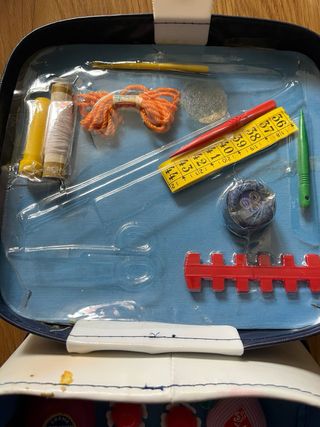 Costurero infantil de estilo vintage. Ideal para guardar materiales de costura. - Diseño clásico. - Asa para facilitar su transporte. -Incluye también accesorios de peluqueria