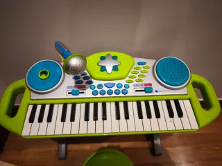 Teclado musical de juguete para niños, con un diseño divertido y colorido. - Incluye micrófono. - Altavoces integrados. - Teclas de piano blancas y negras. - Botones de función y ritmos. - Asa para facilitar el transporte.