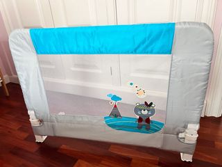 Barrera de seguridad para cama infantil. Cuenta con un diseño divertido con un oso y un volcán. Usada en contados ocasiones. - Tejido de malla transpirable. - Estructura de metal. - Funda textil gris y azul. - Bolsa de transporte incluida.
