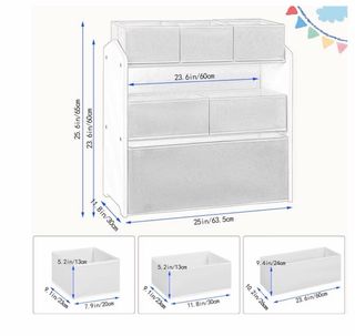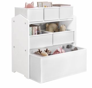 Práctico organizador infantil de la marca Lestarain, ideal para mantener el orden en la habitación de los más pequeños. Su diseño blanco se adapta a cualquier decoración. - Estructura de madera blanca. - Múltiples compartimentos para juguetes y libros. - Incluye cubos de tela. - Diseño de casa en los laterales.