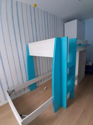 Cama litera infantil con un diseño moderno y funcional, ideal para habitaciones de niños. Si precio original en Conforama fueron 700€ sin incluir colchones. - Las medidas son 287 cm de largo, 115 cm de ancho y 150 cm de alto. - Estructura blanca y detalles en madera. - Incluye escaleras de acceso. - Dispone de cajones de almacenamiento y armario de mucha capacidad - Incluye los dos colchones, uno con estampado de colores. No se puede enviar, hay que venir a desmontarlo.