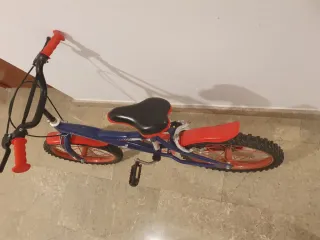 Bicicleta infantil de color rojo con ruedas negras. Casi sin uso. - Manillar con puños naranjas y timbre rosa. - Sillín negro. - Ruedines no visibles.