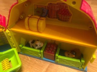 Set de granja infantil con tractor, remolque y animales. - Incluye figura de granjero. - Tractor de color verde con ruedas azules. - Remolque verde. - Dos figuras de animales (vaca y cerdo). - Estructura de granja con puertas y ventanas.