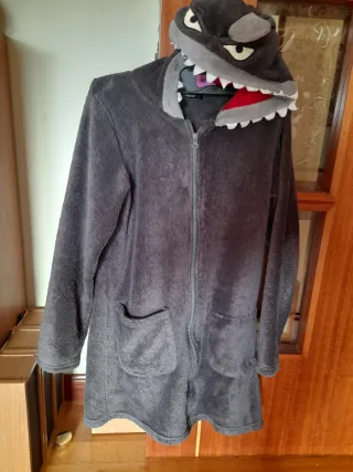Bata de niño que simula a un tiburón.ideal para estar cómodo en casa. Es suave y calentita. A mi hijo le encantaba Se le descosido un bolsillo y mi madre lo cogió al revés y tiene la abertura en el lateral en vez de arriba pero como era para casa no lo cambiamos. El gorro la parte de dentro roja que es de otro tejido está ajeadilla con bolitas por lo demás en buen estado. - Cierre de cremallera. - Dos bolsillos delanteros.