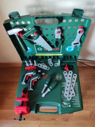 Vendo banco de herramientas BOSCH para niños. Muy completo y con numerosos accesorios para fomentar el juego creativo. Incluye: - Martillo, sierra, alicates y llave inglesa. - Dos taladros eléctricos con luz y sonido y dos destornilladores. - Tornillos, tuercas y piezas de construcción. - Gato para enroscar y desenroscar tuercas.