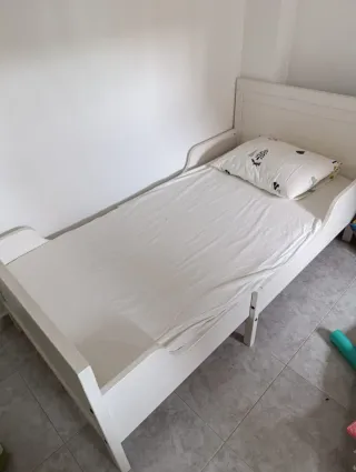 Cama infantil modelo Kritter de IKEA. Ideal para habitaciones infantiles. - Estructura de madera blanca. - Diseño sencillo y funcional. Es robusta, cómoda y muy bonita. - Incluida barandilla y el somier - Incluido colchón marca Best Care Visco, con dos lados, que costó 195€. Como nuevo sin manchas de orina ni sudor. De muy buena calidad y muy cómodo para los niñ@s. - Incluyo 2 fundas de colchón impermeables y 3 sábanas bajeras blancas La cama se encuentra sin ninguna marca de uso, usada solo semanas alternas. La vendo para poner un canapé abatible por necesitar almacenaje. Se encuentra montada, pero se podría desmontar sin problema.