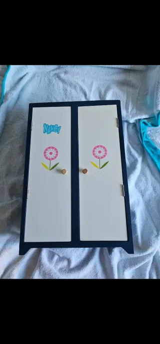 Armario decorado con el nombre Nancy y flores. - Diseño infantil. - Puertas con tiradores redondos. - Marco exterior azul oscuro.