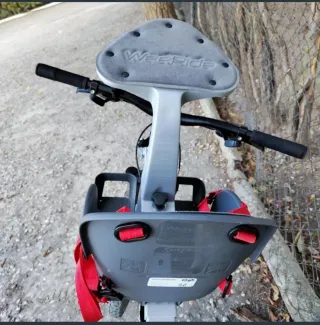 Silla infantil para bicicleta de la marca Weeride. Diseñada para montar en la parte delantera. - Asiento acolchado. - Arnés de seguridad rojo. - Reposapiés integrado. La silla infantil Weeride está adaptada para niños de 1 a 4 años. La sujeción y la seguridad del niño están garantizadas por un arnés de 5 puntos y una protección para las piernas con unos reposapiés anchos y ajustables en altura. La silla puede transportar hasta 15 kg
