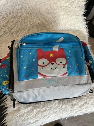 Bolso de merienda con un divertido diseño de gato superhéroe. - Color azul con estrellas y detalles. - Cremallera para cierre. - Asa para colgar.