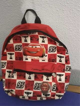 Mochila infantil con diseño de Rayo McQueen de Cars. - Color rojo y blanco. - Estampado a cuadros con imágenes del personaje. - Cremallera frontal. - Asa superior y tirantes ajustables.