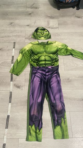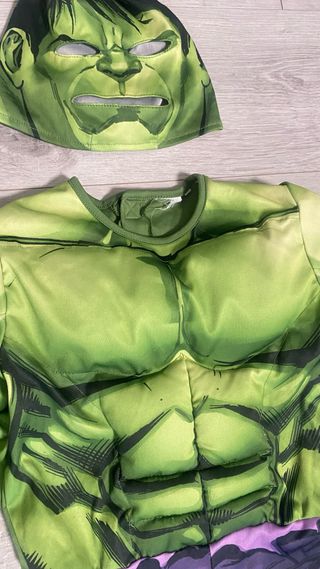 Disfraz del personaje Hulk, ideal para fiestas o eventos. - Incluye máscara y traje completo. - Diseño inspirado en el personaje. - Tejido verde y morado.