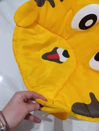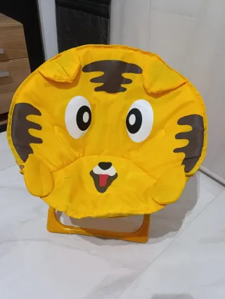 Silla infantil plegable con un divertido diseño de tigre. - Color amarillo brillante. - Estructura de plástico resistente. - Asiento acolchado. - Fácil de plegar y guardar. - Medidas plegada: 54x 52x 6 - Medidas montada: 24 (altura hasta el asiento) - El único defecto son las manchas negras que se aprecian en las fotos.