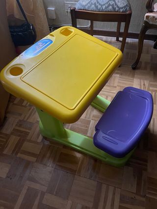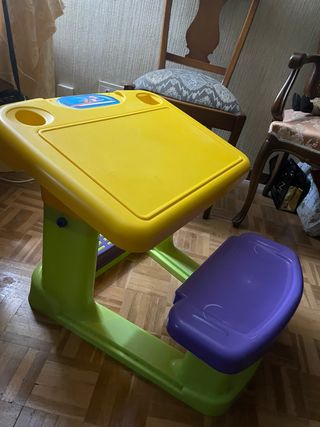 Pupitre infantil para niño o niña con asiento integrado, ideal para actividades creativas y de estudio. - Superficie de escritura amarilla. - Asiento de color morado. - Estructura de base en color verde. #MesaInfantil #PupitreInfantil #EscritorioInfantil #MesaEstudioNiño #MesaEstudioNiña #EscritorioNiños #MobiliarioInfantil #HabitacionInfantil #EscritorioEscolar #PupitreEscolar #MesaParaNiños #EscritorioJuvenil #MesaAprendizaje #ZonaDeEstudio #VueltaAlCole #DecoracionInfantil #MueblesInfantiles #MesaConAlmacenaje #EscritorioCompacto #SegundaManoInfantil #Mesa #Cama #Muñeca #Juguete #Coche #iPhone #Bici #Zara #Ikea