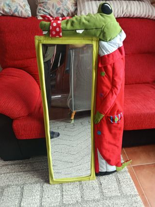 Divertido espejo con forma de cocodrilo para habitación infantil. El marco es de color verde lima y el cocodrilo lleva un traje rojo con detalles. Soporta todo tipo de golpes no es cristal. - Diseño de cocodrilo. - Marco de color verde lima. - Traje rojo con botones.