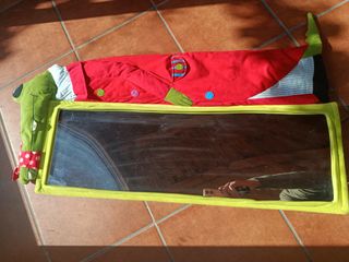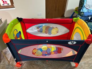 Cuna de viaje con un alegre diseño de oruga y colores vivos. - Estructura resistente con laterales de malla. - Ruedas naranjas en las patas para facilitar el movimiento. - Detalle de logo 'MS' en el lateral.