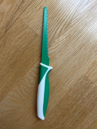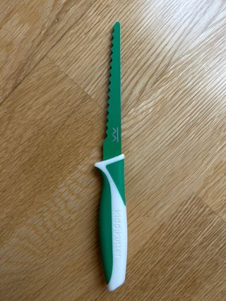 Cuchillo de plástico para niños Kiddikutter. - Hoja dentada de color verde. - Mango ergonómico bicolor (verde y blanco). - Texto Kiddikutter en el mango.