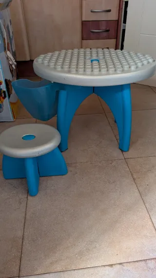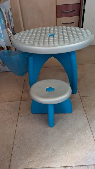 Conjunto de mesa y taburete de juegos para niños. - Mesa redonda con superficie para construcción. - Taburete a juego. - Color azul y plateado. - No dispongo de las piezas de construcción.