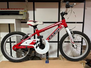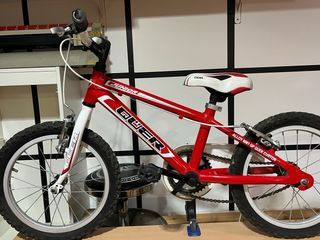 Bicicleta infantil de la marca Quer, modelo 160, en color rojo y blanco. Ideal para los más pequeños. - Cuadro de aleación 6061. - Ruedas de 16 pulgadas. - Diseño deportivo con detalles a cuadros.