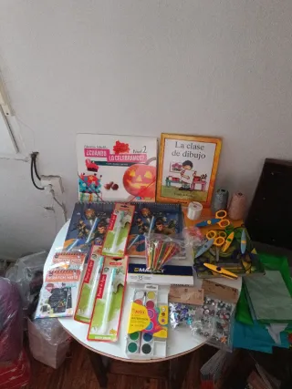 Lote de material para actividades artísticas infantiles. Tijeras de formas y 2 tijeras normales - Libros ¿Cuándo lo celebramos? Nivel 2 con fichas para hacer plástica y La clase de dibujo. -2 Cuadernos Scratch Note. - 3 Pinceles de agua. - Caja de acuarelas Jovi. Caja pintura Manley Más de veinte agujas de plástico duro - 2 Rollos de hilo. Dorado y plateado un rollo de hilo de coco - Adhesivos decorativos. Dos blocs de dibujo de Star wars uno con plantilla y otro ángulo de dibujo y un libro para dibujar a las tortugas. Se puede ver en la foto todo lo que entra el precio es por todo lote