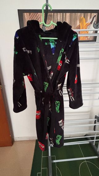 Bata infantil de Minecraft, color negro con estampado de Creepers y TNT. Con capucha, bolsillos y cinturón. ✔ Talla etiqueta: 14-16 años ✔ Medidas reales: – Largo: 94 cm – Manga: 51 cm Estado: usada pero impecable, sin manchas, sin rotos ni desgaste. Tejido suave y muy calentito, perfecta como bata de invierno para casa. Ideal como: – Bata niño Minecraft – Albornoz infantil invierno – Regalo gamer – Ropa de estar en casa niño Se recomienda revisar medidas para asegurar ajuste.
