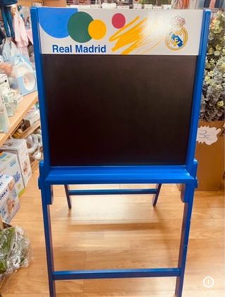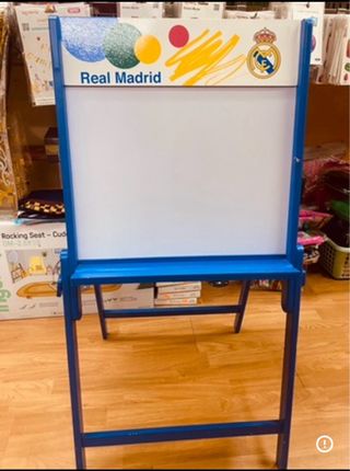Pizarra de doble cara con temática del Real Madrid. Ideal para que los más pequeños den rienda suelta a su creatividad. - Diseño con el escudo y colores del Real Madrid. - Marco y estructura de color azul. - Superficie blanca para escribir o dibujar.