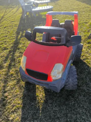 Coche todoterreno infantil de dos plazas, ideal para que los más pequeños disfruten al aire libre. - Color principal rojo con detalles en gris. - Rueda de repuesto en la parte trasera. - Volante y asientos visibles en el interior.